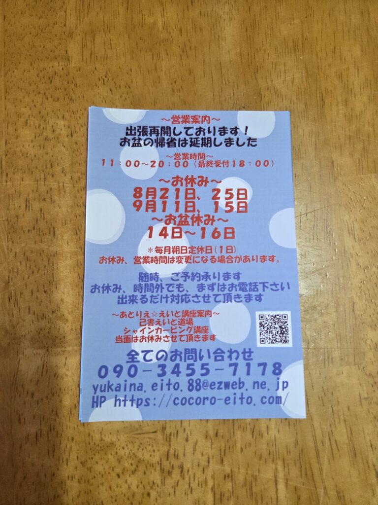 営業時間:11:00-20:00(最終受付:18:00)*時間外の場合は前日までにご予約頂けると助かります
